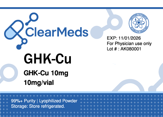 GHK-Cu supports skin and tissue regeneration by promoting collagen production, reducing inflammation, and enhancing cellular repair. It is widely used for recovery, skin health, and anti-aging support.