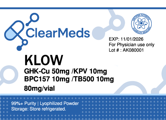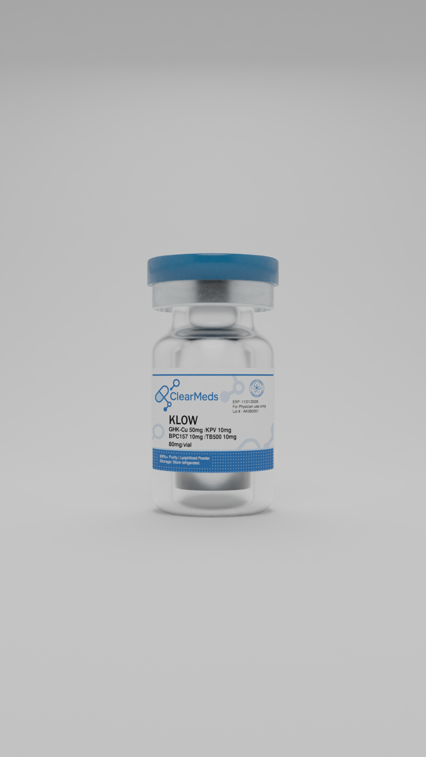 KLOW 80 is a 4-peptide regenerative blend designed to accelerate healing, reduce inflammation, and support full-spectrum tissue repair. It combines GHK-Cu, KPV, BPC-157, and TB500 for powerful, synergistic recovery support.